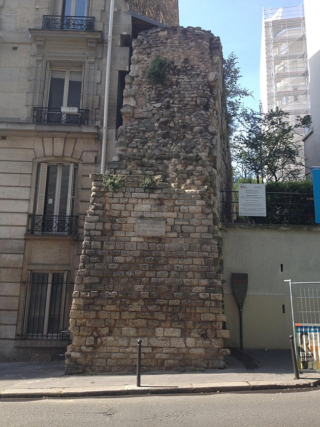 After a lovely walk through the native plant gardens at Arena Lutece (the ancient Roman arena uncovered under the city of Paris), I made my way up the Rue Rollin, on to Rue du Cardinal Lemoine and then to 12 Rue Clovis and the large section of the wall visible on the left bank. There is a small plaque, as there are throughout Paris, next to the enceinte that gives the history. In this case, the wall, three Paris stories high, has been used to support the adjoining building. A smart engineer or architect incorporated the thick, ancient wall into the design for the attached building just as the architects during Philippe’s and later times used the wall for support, insulation, and defense.